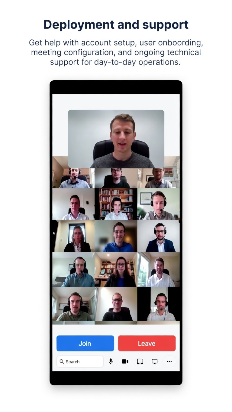 Get help with account setup, user onboarding, meeting configuration, and ongoing technical support for day-to-day operations.